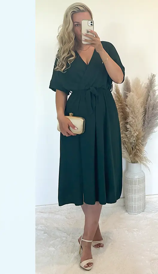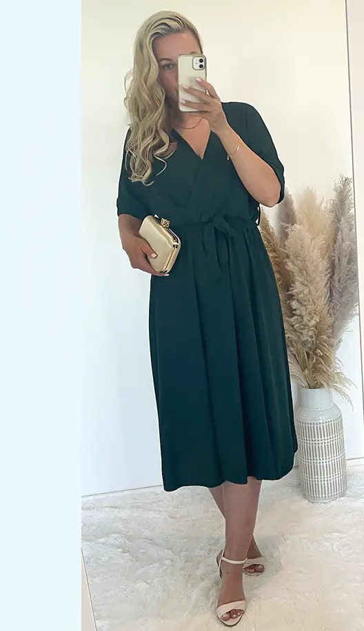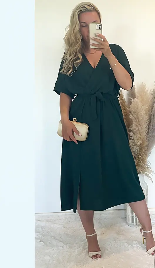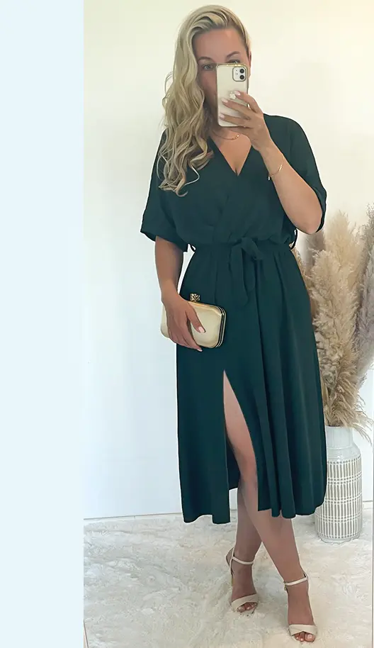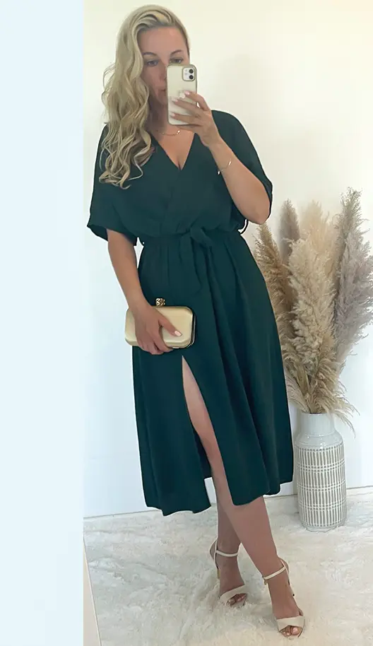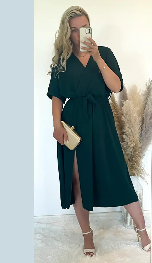Sukienka butelkowa zieleń z rozporkiem, dekolt na zakładkę, w pasie gumka plus pasek.