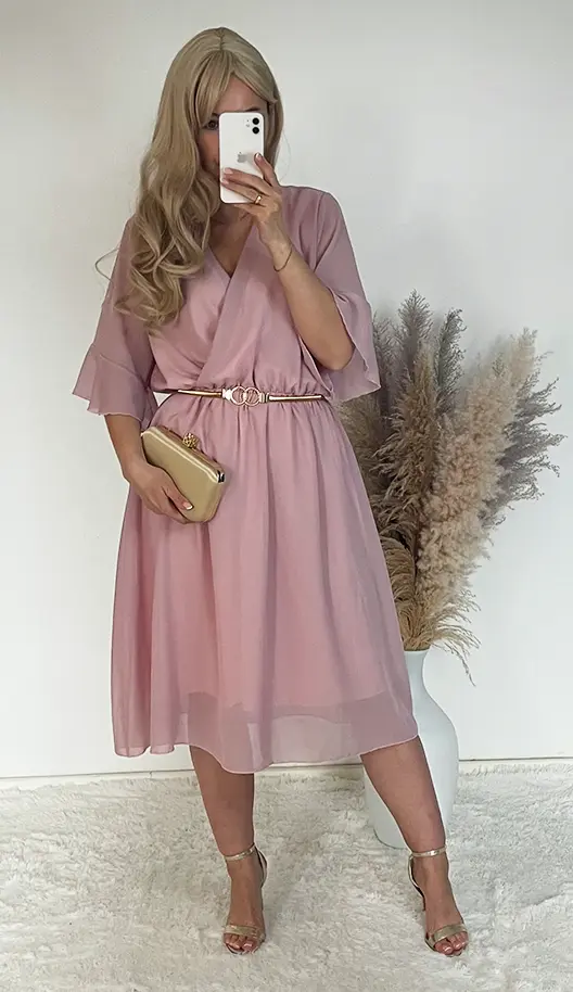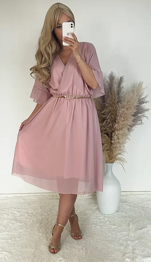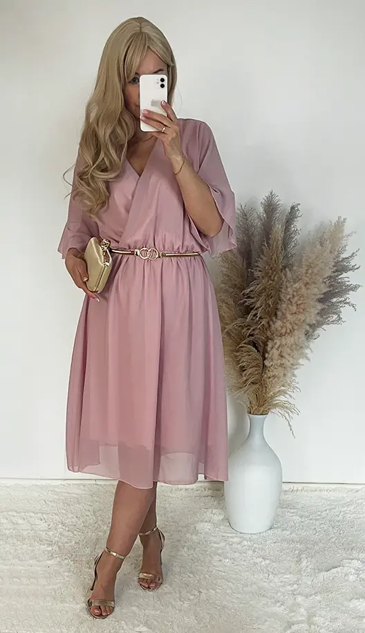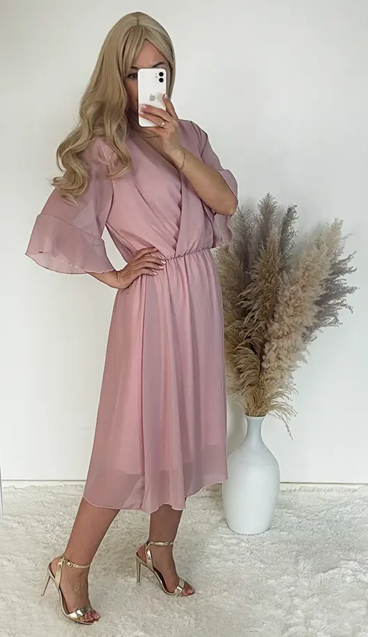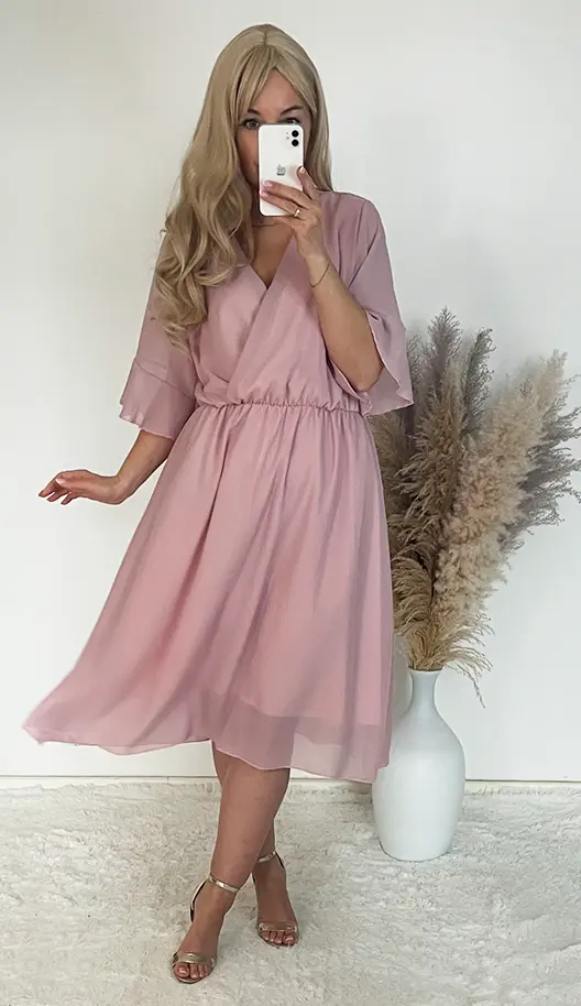 Sukienka szyfonowa z podszewką w kolorze pudrowego różu. Kolekcja wiosna lato 2025. Polska produkcja .